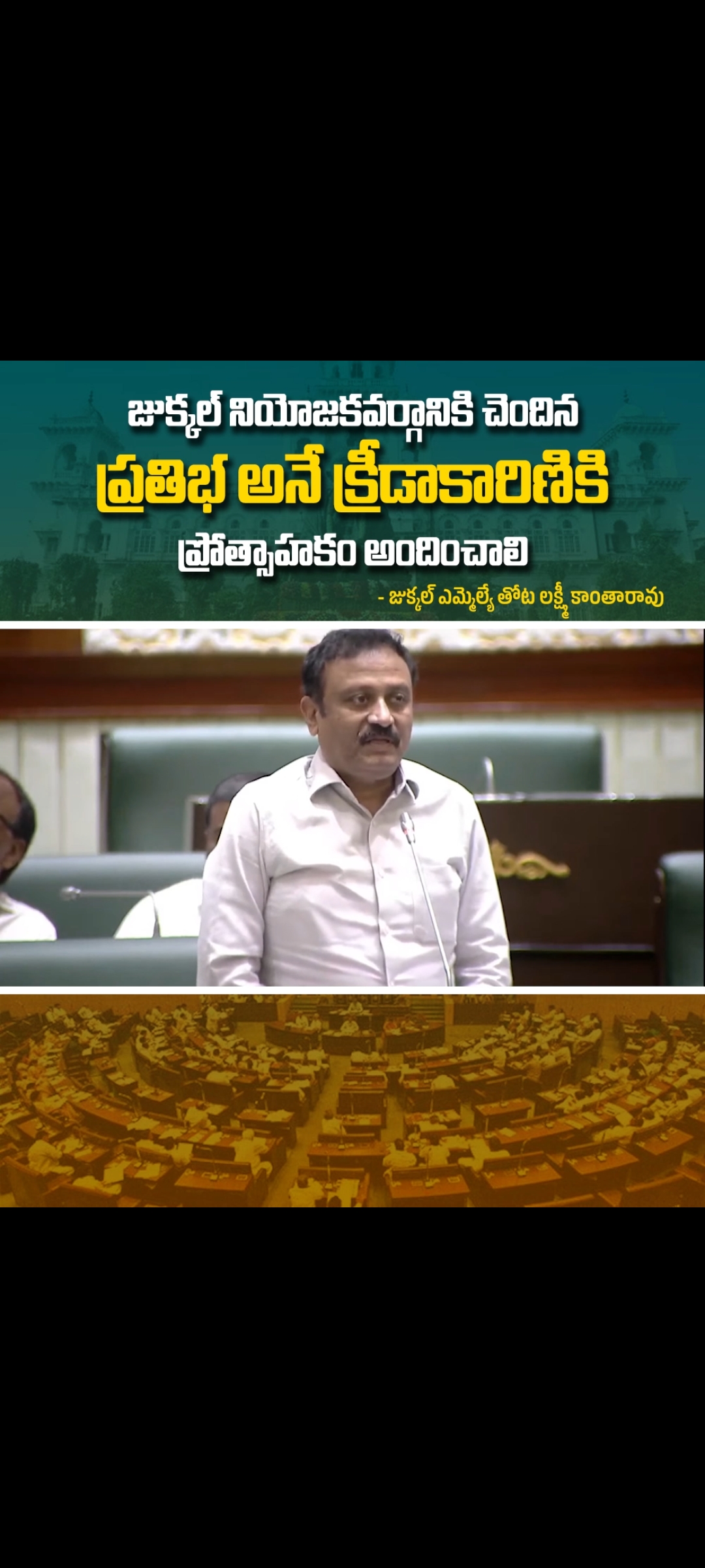 జుక్కల్ ఎమ్మెల్యే తోట లక్ష్మీ కాంతారావు శుక్రవారం అసెంబ్లీలో మాట్లాడుతూ ముఖ్యమంత్రి రేవంత్ రెడ్డి తెలంగాణకు చెందిన క్రీడాకారులు బాక్సర్ నిఖత్ జరీన్ మరియు క్రికెటర్ మహమ్మద్ సిరాజ్ లకు ఇచ్చిన గుర్తింపు పట్ల ధన్యవాదాలు తెలియజేస్తూ అదేవిధంగా జుక్కల్ నియోజకవర్గానికి చెందిన ప్రతిభ అనే క్రీడాకారిణి వివిధ క్రీడలలో రాణిస్తున్నదని తెలిపారు.ఈమధ్య కోల్ కతాలో జరిగిన ఇండియా & ఏషియన్ చెస్, బాక్సింగ్ ఛాంపియన్ షిప్ లో ఐదు గోల్డ్ మెడల్స్ ఒక సిల్వర్ మెడల్ సాధించిందని,