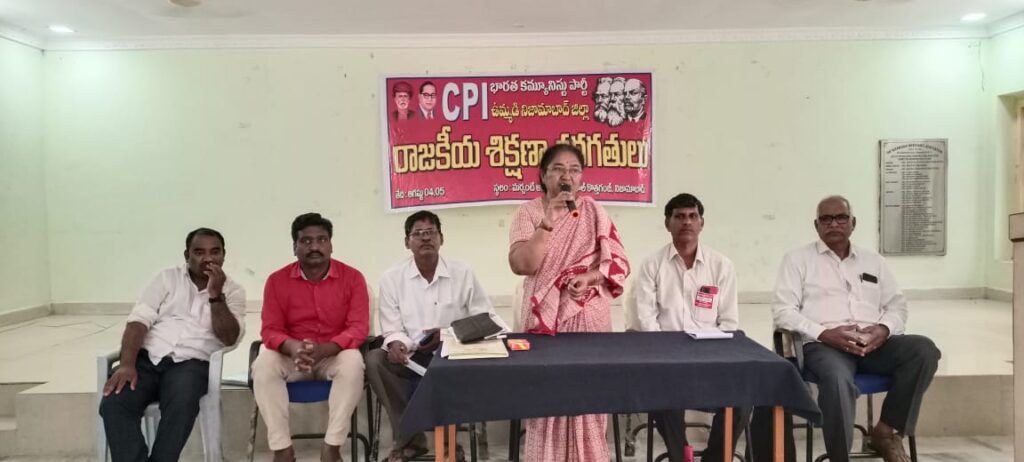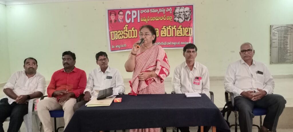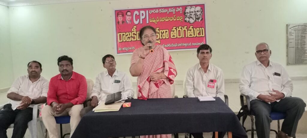 స్థానిక కొత్త గంజిలోని మర్చంట్ అసోసియేషన్ హాల్ లో సిపిఐ రాష్ట్ర నాయకులు కంజర భూమయ్య అధ్యక్షతన జరిగిన సిపిఐ రాజకీయ శిక్షణ తరగతులను ఉద్దేశించి పశ్య.పద్మ మాట్లాడుతూ సామాజిక న్యాయం కోసం, లౌకిక సాంప్రదాయాల పరిరక్షణకు భవిష్యత్తు కార్యచరణలో భాగం కావాలన్నారు.