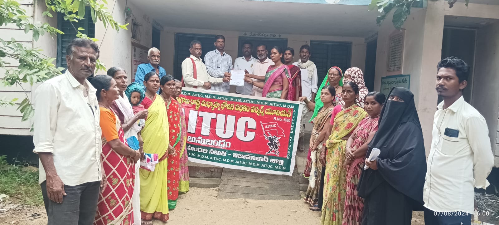 జిల్లా ప్రధాన కార్యదర్శి తోపునూరు చక్రపాణి డిమాండ్ చేశారు. కోటగిరి మండలం, కొత్తపల్లి గ్రామంలో మధ్యాహ్న ఏజెన్సీ నిర్వాహకురాలిపై స్థానిక ప్రధానోపాధ్యాయుడు కావాలని వంట చేసిన తర్వాత మధ్యాహ్న భోజన ఏజెన్సీ మీద కక్ష పెట్టుకున్న హెచ్ఎం పిల్లలు భోజనం చేసినాక నలుగురు పిల్లల ప్లేట్లలో కారంపొడి వేసి ఫోటోలు తీసి దాన్ని వైరల్ చేసి ఆ ఏజెన్సీని తొలగించి మరొక ఏజెన్సీకి పెట్టడం కోసం కుట్ర చేశారని దీన్ని ఏఐటీయూసీ మధ్యాహ్న భోజన పథకం వర్కర్స్ యూనియన్ గా తీవ్రంగా ఖండిస్తున్నామని అన్నారు. ఏజెన్సీ నిర్వాహకులను బదనాంకు కారణమైన హెచ్ఎంపై చర్యలు తీసుకోవాలని బుధవారం అదనపు కలెక్టర్ కిరణ్ కుమార్ కి డీఈవో దుర్గాప్రసాద్ కు వినతి పత్రం సమర్పించారు. అధికారులు పారదర్శకంగా విచారణ జరిపి హెడ్మాస్టర్ పై చర్యలు తీసుకొని మధ్యాహ్న భోజన ఏజెన్సీకి నిర్వాహకులకు న్యాయం చేయాలని, కోరారు. కింది స్థాయి అధికారులు విషయం ప్రచారమైనందున ఏ రకంగా నైనా దీని నుంచి తప్పించుకోవటానికి హెడ్మాస్టర్ కు సహకరించడంలో భాగంగా అమాయకురాలైన ఏజెన్సీ నిర్వాహకురాలిపై చర్యలు తీసుకునే ఆలోచన చేస్తున్నారని ఇది నిజమైతే ఏఐటీయూసీ మధ్యాహ్న భోజన కార్మిక సంఘంగా ఆందోళన చేస్తామని హెచ్చరించారు. ఈ కార్యక్రమంలో భూమయ్య ఉషారాణి, అలీ,వీరేశం పాల్గొన్నారు.