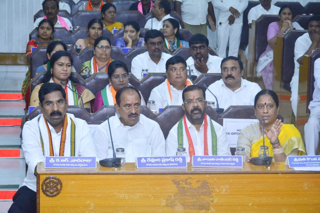 గ్రేటర్ వరంగల్ మున్సిపల్ కార్పొరేషన్ కార్యాలయంలో మేయర్ గుండు సుధారాణి అధ్యక్షతన నిర్వహించిన సర్వసభ్య సమావేశంలో అటవీ పర్యావరణ దేవాదాయ ధర్మాదాయ శాఖల మంత్రులు కొండా సురేఖ మరియు పశ్చిమ ఎమ్మెల్యేలు నాయిని రాజేందర్ రెడ్డి, రేవూరి ప్రకాష్ రెడ్డి తో కలిసి పాల్గొన్న వర్ధన్నపేట ఎమ్మెల్యే విశ్రాంత ఐపీఎస్ అధికారి కేఆర్ నాగరాజు.ఈ సందర్భంగా సభ మొదటగా 61వ డివిజన్ కార్పొరేటర్ దివంగత ఎలకంటి రాములు మరణానికి సంతాపం తెలియజేసి, మౌనం పాటించింది.