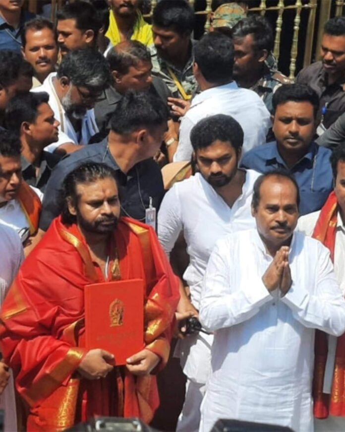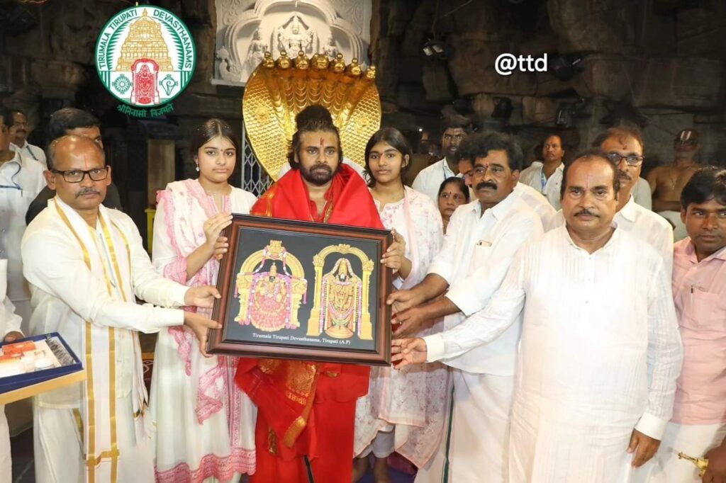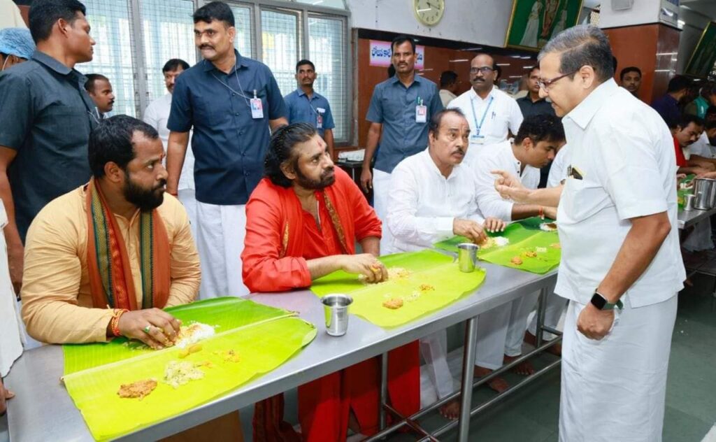 మాతృశ్రీ తరిగొండ వెంగమాంబ అన్నదాన కేంద్రంలో అన్న ప్రసాదం స్వీకరించారు. సనాతన ధర్మ పరిరక్షణ కోసం ప్రాయశ్చిత్త దీక్ష చేపట్టిన ఉప ముఖ్యమంత్రి పవన్ కళ్యాణ్ బుధవారం తిరుమల శ్రీ వెంకటేశ్వరస్వామి దర్శనం చేసుకుని దీక్ష విరమించారు. 11 రోజులపాటు సాగిన ఆయన దీక్షలో భాగంగా ఇటీవల చోటు చేసుకున్న కొన్ని పరిణామాల నేపధ్యంలో సనాతన ధర్మాన్ని రక్షించాల్సిన బాధ్యత భుజాలకెత్తుకుని ప్రాయశ్చిత్త దీక్ష చేపట్టిన విషయం తెలిసిందే. మంగళవారం రాత్రికి అలిపిరి నుంచి మెట్ల మార్గం ద్వారా తిరుమల చేరుకున్న పవన్ కళ్యాణ్ బుధవారం ఉదయం వీఐపీ బ్రేక్ దర్శన సమయంలో తన ఇద్దరు కుమార్తెలు ఆద్య కొణిదెల, పలీనా అంజని కొణిదెలలతో కలసి మహాద్వారం ద్వారా ఆలయంలోకి ప్రవేశించి స్వామి వారిని దర్శించుకున్నారు. తన ఇద్దరు కుమార్తెలతో స్వామి వారి దర్శనానికి వెళ్లిన పవన్ కళ్యాణ్ ప్రత్యేక పూజలు చేసి వారాహి డిక్లరేషన్ ని స్వామి వారి పాదాల చెంత ఉంచి ప్రత్యేక పూజల్లో పాల్గొన్నారు. అనంతరం ఆలయ ప్రాంగణంలోని శ్రీ రంగనాయకుల మండపంలో వేద పండితులు పవన్ కళ్యాణ్ కి ఆశీర్వచనం చేసి స్వామి వారి చిత్రపటంతో పాటు తీర్థ ప్రసాదాలు అందజేశారు.