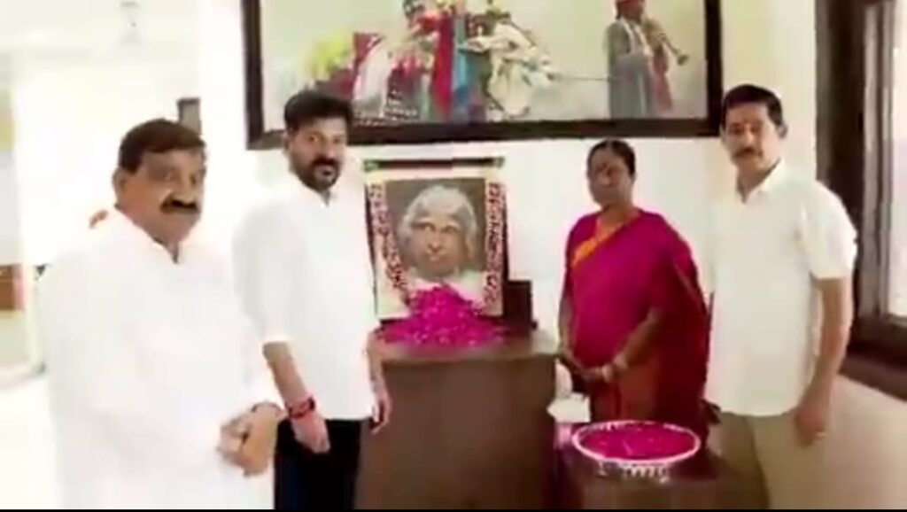మాజీ రాష్ట్రపతి ఏపీజే అబ్దుల్ కలాం జయంతి సందర్భంగా ముఖ్యమంత్రి రేవంత్ రెడ్డి, ఈరోజు ఘన నివాళులు అర్పించారు. మంగళవారం జూబ్లీహిల్స్ లోని ముఖ్యమంత్రి నివాసంలో కలాం చిత్రపటానికి పూలమాల వేసి పుష్పాంజలి ఘటించారు.