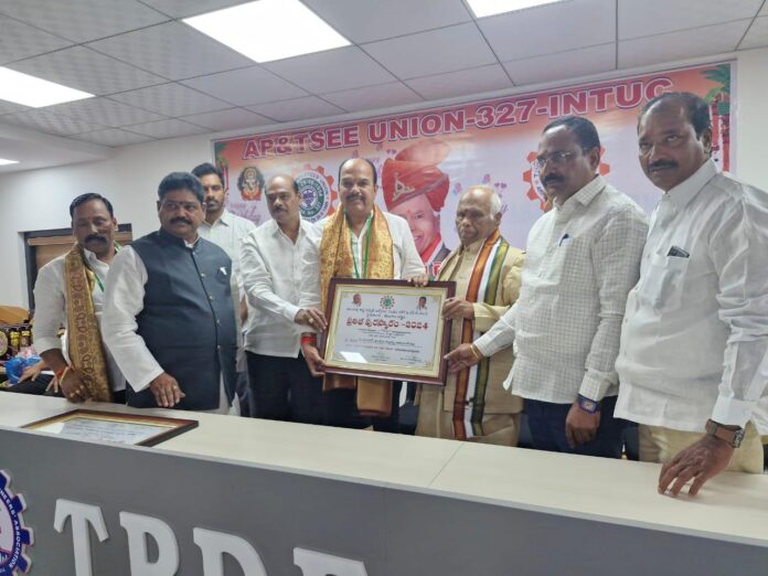 నిజామాబాద్ జిల్లా ఐ ఎన్ టి యు సి జిల్లా స్థానిక అధ్యక్షులు వేణుగోపాల్ బెస్ట్ లీడర్ గా ఎంపికయ్యారు. హైదరాబాదులో తెలంగాణ రాష్ట్ర విద్యుత్ ఉద్యోగుల సంఘం 327 ఐ ఎన్ టి యు సి రాష్ట్ర నాయకులు కార్యదర్శి శ్రీధర్, అధ్యక్షులు సంజీవరెడ్డి చేతుల మీదుగా వేణు గోపాల్ కు ప్రతిభ పురస్కారం అందజేశారు. కాంగ్రెస్ పార్టీ అనుబంధ ఉద్యోగ సంఘముగా కొనసాగుతూ కార్మికులకు ఏ కష్టం వచ్చినా తానున్నానంటూ వేణు కార్మికులకు భరోసా ఇస్తున్నారు. తమ సంఘం కాంగ్రెస్ పార్టీకి అనుబంధంగా ఉందని తెలంగాణ రాష్ట్రంలో కాంగ్రెస్ పార్టీ అధికారంలో వచ్చేందుకు తమ సంఘం సైతం కృషి చేసిందన్నారు. కార్మికుల కష్టాలను తాను చూస్తూ ఊరుకునేది లేదని ఎవరికైనా సమస్య వస్తే తాను పరిష్కారానికి కృషి చేస్తానని వ్యక్తం చేశారు. ఉద్యోగులు ప్రభుత్వ నిబంధనల మేరకు విడుదల నిర్వహిస్తూ తమ హక్కుల కోసం పోరాటం చేయడంలో తప్పు లేదన్నారు. కార్మికుల సమస్యలు ఎన్నో పెండింగ్లో ఉన్నాయని అటువంటి సమస్యల పరిష్కారానికి కృషి చేస్తానని సమస్యల పరిష్కారం కోసం తమ సంఘం రాష్ట్ర బాధ్యుల దృష్టికి ఇప్పటికే తీసుకువెళ్లాలని వేణు గోపాల్ స్పష్టం చేశారు. సంఘ నాయకుల సైతం విధులను నిర్వహిస్తూ మరో పక్క కార్మిక శ్రేయస్సుకోసం కృషి చేయాలని పిలుపునిచ్చారు.