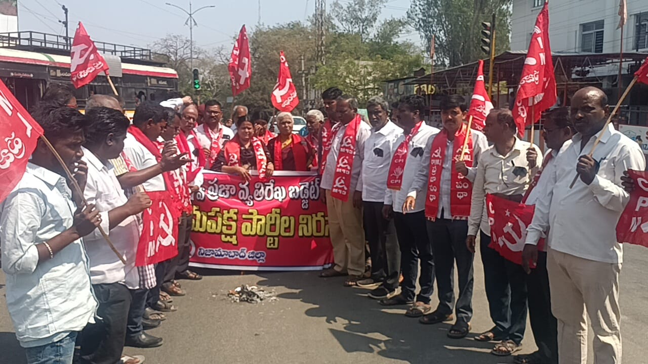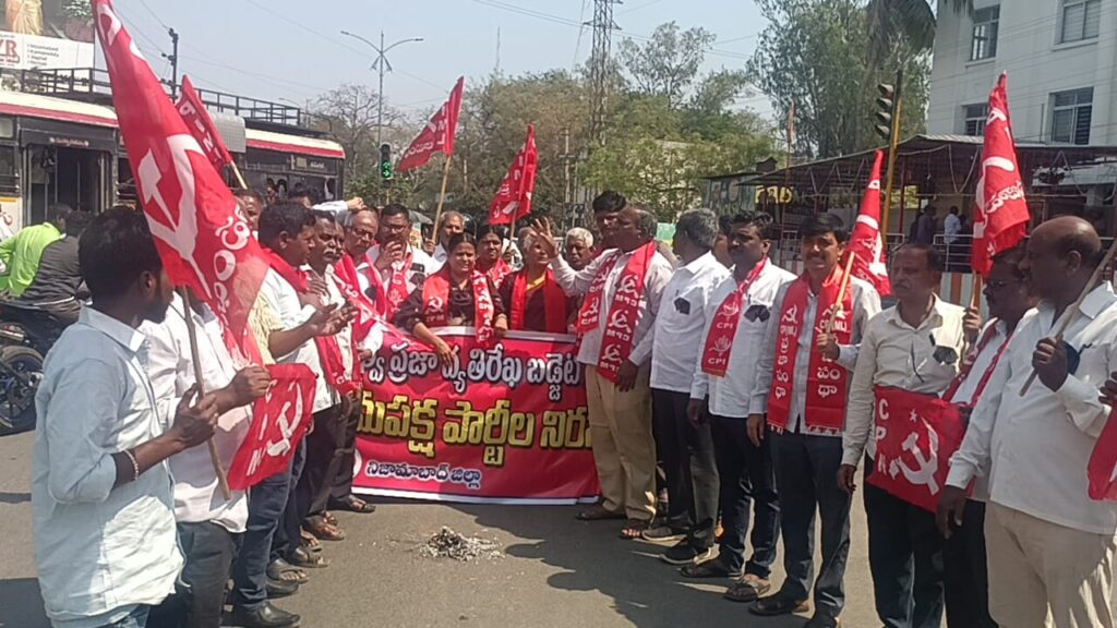 కేంద్రప్రభుత్వం ప్రవేశపెట్టిన బడ్జెట్ ను వ్యతిరేకిస్తూ ప్లే కార్డులతో మరియు నల్ల బ్యాడ్జీలను ధరించి నేడు వామపక్ష పార్టీల ఆధ్వర్యంలో ధర్నా చౌక్ లో నిరసన చేయడం జరిగింది.ఈ సందర్భంగా సిపిఐ జిల్లా కార్యదర్శి పి.సుధాకర్ మాట్లాడుతూ కేంద్ర ప్రభుత్వం ఇటీవల పార్లమెంట్లో ప్రవేశపెట్టిన బడ్జెట్ సంపన్నులకు,కార్పొరేటర్ వ్యక్తులకు అనుకూలంగా ఉన్నదని ఈ దేశంలో జీఎస్టీ చెల్లిస్తున్న సామాన్య, మధ్యతరగతి ప్రజలకు వ్యతిరేకంగా ఉందని వ్యవసాయ రైతాంగానికి, నిరుద్యోగులకు ఈ బడ్జెట్లో నామమాత్ర కేటాయింపులే ఉన్నాయని అన్నారు బోధన్- బీదర్ రైల్వే మార్గం ఊసే లేదని, ఈ మధ్యకాలంలో ప్రకటించిన పసుపు బోర్డుకు నిధులు కేటాయించలేదని ఇకనైనా బడ్జెట్ ను సవరించాలని డిమాండ్ చేశారు.