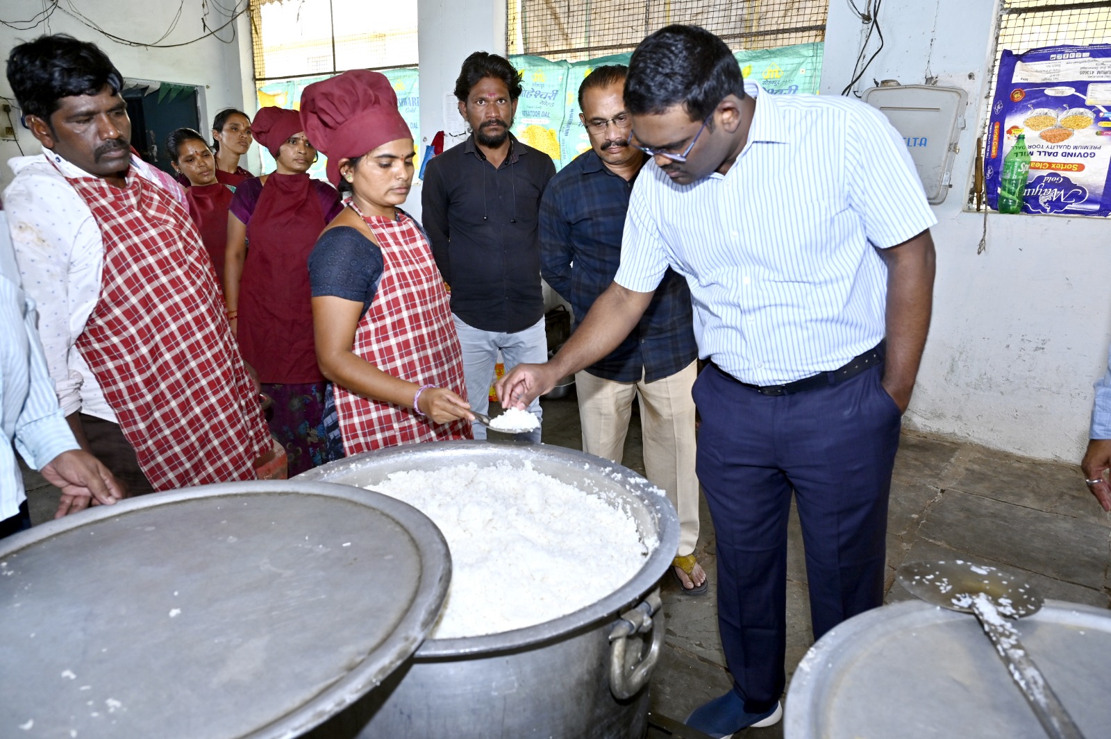 బాలికల రెసిడెన్షియల్ పాఠశాల/కళాశాలను ఆకస్మికంగా తనిఖీ చేశారు. పాఠశాలలో కిచెన్, డైనింగ్ హాల్, స్టోర్ రూం లను సందర్శించి బియ్యం, కూరగాయలు, పప్పు దినుసులు, వంట నూనె, ఇతర సరుకుల నాణ్యతను పరిశీలించారు. కొత్త బియ్యం కావడం వల్ల వండిన అన్నం మెత్తగా అవుతోందని నిర్వాహకులు తెలుపగా, నాణ్యమైన బియ్యం కేటాయించేలా చర్యలు తీసుకోవాలని సంబంధిత అధికారులను కలెక్టర్ ఆదేశించారు. కాగా, విద్యార్థినులకు మాంసాహారంతో కూడిన భోజనం అందించాల్సినపుడు చికెన్ కు బదులుగా మటన్ పెడుతున్నామని ప్రిన్సిపాల్ గంగాశంకర్ కలెక్టర్ దృష్టికి తెచ్చారు. కలెక్టర్ వెంట గృహ నిర్మాణ శాఖ ప్రాజెక్టు డైరెక్టర్ సత్యనారాయణ తదితరులు ఉన్నారు.