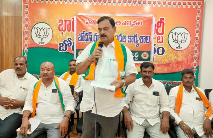 తెలంగాణ రాష్ట్రంలో రాబోయే స్థానిక ఎన్నికల్లో బిజెపి గెలుపే లక్ష్యంగా కార్యకర్తలు పని చేయాలని రాష్ట్ర కార్యవర్గ సభ్యులు వడ్డీ మోహన్ రెడ్డి పిలుపునిచ్చారు. ఇప్పటికే కాంగ్రెస్ ప్రభుత్వం ప్రజల్లో నమ్మకాన్ని కోల్పోయిందని స్థానికేతకల్లో కాంగ్రెస్ పార్టీకి పరాభం ఎదురు కాబోతుందని స్థానికన ఎన్నికల్లో ప్రజలు బిజెపి వైపు మొగ్గుచూపు పోతున్నారని ఆయన జోస్యం చెప్పారు.బోధన్ పట్టణంలోని ఎం పి ఆర్ కార్యాలయంలో బోధన్ రూరల్ మండల అధ్యక్షులు సిర్ప సుదర్శన్ అధ్యక్షతన స్థానిక సంస్థల ఎన్నికల కార్యశాల నిర్వహించారు . కార్యక్రమానికి బిజెపి రాష్ట్ర కార్యవర్గ సభ్యులు వడ్డీ మోహన్ రెడ్డి ముఖ్య అతిథులుగా హాజరయ్యారు. మాట్లాడుతూ రానున్న స్థానిక సంస్థల ఎన్నికల్లో కార్యకర్తలు కష్టపడి పార్టీ అభ్యర్థులను గెలిపించాలని పిలుపునిచ్చారు.ప్రజలు బీజేపీ వైపు చూస్తున్నారని కాంగ్రెస్ ప్రభుత్వం ఇచ్చిన హామీలను నెరవేర్చడం విఫలం అయిందని, తెరాస ప్రభుత్వం పది సంవత్సరాలు లక్షల కోట్లు అప్పు చేసిందని కాంగ్రెస్ ప్రభుత్వం అంతకంటే డబుల్ అప్పులు చేస్తుందని అన్నారు. నిజమైన అర్హులకు ఇందిరమ్మ ఇండ్లను ఇవ్వడం లో, రైతు భరోసా,రైతులకు బోనస్ ఇవ్వడం లో,రైతులకు ఋణ మాఫీ చేయడం లో,రాజీవ్ యువ వికాస్ పథకల అమలు చేయడం లో ప్రభుత్వం పూర్తిగా విఫలం అయిందని అందుకు ప్రభుత్వం పై ప్రజలు పూర్తిగా వ్యతిరేకంగా ఉన్నారని విమర్శించారు. బీజేపీ పార్టీ కార్యకర్తలు నాయకులు కావడానికి సిద్ధంగా ఉండాలని ప్రతి ఒక్కరు వార్డు సభ్యులుగా, సర్పంచ్, ఎంపీటీసీ, సొసైటీ డైరెక్టర్, చైర్మన్, గా పోటీ చేయడానికి సిద్ధంగా ఉండాలని పిలుపునిచ్చారు.
