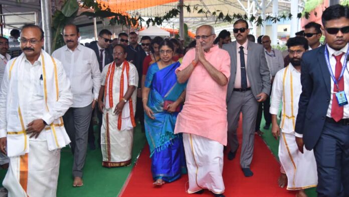దసరా శరన్నవరాత్రులలో మూడవ రోజు బుధవారం అన్నపూర్ణాదేవిగా దర్శనమిస్తున్న అమ్మవారిని భారత ఉపరాష్ట్రపతి సిపి రాధాకృష్ణన్ సతీ సమేతంగా దర్శించుకున్నారు. ఉపరాష్ట్రపతికి రాష్ట్ర సమాచార, పౌర సంబంధాల శాఖ మంత్రి కొలుసు పార్థసారథి, ఎన్టీఆర్ జిల్లా కలెక్టర్ లక్ష్మీశ, దేవాదాయ శాఖ కమిషనర్ రామచంద్ర మోహన్, విఎంసి కమిషనర్ ధ్యానచంద్ర, దుర్గగుడి ఈవో శీనా నాయక్ స్వాగతం పలికారు. ఉపరాష్ట్రపతి క్యూలైన్లలోని భక్తులకు అభివాదం చేస్తూ మహా మండపానికి చేరుకున్నారు. అక్కడ ఉపరాష్ట్రపతి దంపతులకు వేద పండితులు పూర్ణకుంభంతో స్వాగతం పలికారు. అనంతరం అమ్మవారి సన్నిధికి చేరుకొని అన్నపూర్ణ దేవిగా దర్శనమిస్తున్న అమ్మవారిని దర్శించుకున్నారు. వేద పండితులు వేదాశీర్వచనం చేయగా, దేవాదాయ శాఖ కమిషనర్ రామచంద్ర మోహన్, ఈవో శీనా నాయక్ ఉపరాష్ట్రపతికి అమ్మవారి చిత్రపటం, తీర్థ ప్రసాదాలు అందజేశారు.అనంతరం ఉపరాష్ట్రపతి మీడియాతో మాట్లాడుతూ అన్నపూర్ణాదేవిగా దర్శనమిస్తున్న అమ్మవారిని దర్శించుకోవడం దివ్యానుభూతి అని అన్నారు. ప్రజలందరికీ ఆయురారోగ్యాలు ప్రసాదించాలని, రాష్ట్రం అభివృద్ధి పథంలో సాగాలని అమ్మవారిని ప్రార్థించినట్లు తెలిపారు. దేశంలో వేగంగా అభివృద్ధి చెందుతున్న నగరాలలో విజయవాడ ఒకటని చెప్పారు. రాష్ట్రం అద్భుతమైన వృద్ధి సాధిస్తుందని ఆశాభావం వ్యక్తం చేశారు. ప్రజలందరికీ దసరా నవరాత్రుల శుభాకాంక్షలు తెలియజేశారు.