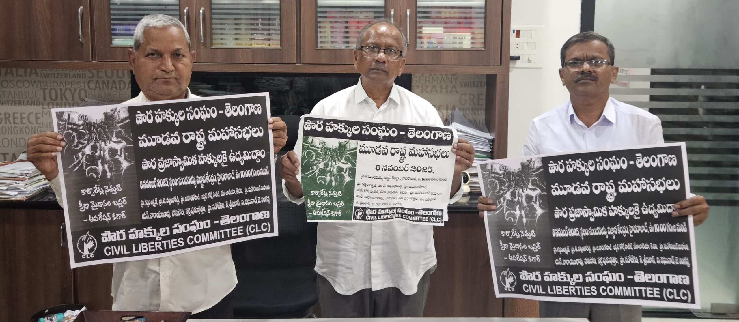 ఉమ్మడి జిల్లా అధ్యక్షుడు వి. సంఘం అడ్వకేట్ మాట్లాడుతూ పౌర సంఘం గత ఐదు శతాబ్దాలుగా ఉమ్మడి ఆంధ్రప్రదేశ్ రాష్ట్రంలో తెలంగాణ బలోపేతం మైన వారు హక్కుల ఉద్యమాన్ని నిరసిస్తూ త్యాగాలతో ముందుకు సాగుతున్నదని సుదీర్ఘకాలంగా పనిచేస్తున్న ఉద్యమం ఒకవైపు నిర్బంధాన్ని ఎదుర్కొంటూ మానవ హక్కుల ఉద్యమాన్ని చేస్తూ ముందు వరుసలో ఉందని అన్నారు. ఉద్యమంలో పోరాడుతూ ఎంతోమంది నేతలు ప్రాణాలర్పించారు రాజ్యం బూటకపు ఎన్ కౌంటర్ లలో ఉద్యమకారులను హత్యలు చేసిందని, ఇప్పటివరకు జరిగిన ఎన్ కౌంటర్ లపై సుప్రీంకోర్టు న్యాయమూర్తిచే విచారణ జరిపించాలని అన్నారు. వాటికి కారకులైన వారిపై కేసులు నమోదు చేసి, జీవించే హక్కు, భావ ప్రకట నా స్వేచ్చకై పౌర హక్కుల సంఘం పోరాడుతుందని, మరోవైపు ప్రభుత్వ వర్గాలు ప్రాంతం, జాతి, మతం, కులాల పేర్లతో కొనసాగుతున్న అన్ని రూపాలలోని అణచివేతను హక్కుల సంఘం ప్రశ్నిస్తుందని మధ్య భారత ఆదివాసి ప్రాంతాలలో ఎయిర్ బాంబింగ్ ద్వారా అమాయక ఆదివాసీలను వారి మహిళల పట్ల అరాచకాలను పౌర హక్కుల సంఘం ఖండిస్తున్నది. మధ్య భారత దేశంలో దట్టమైన అడవులలో విస్తారమంతమైన కనిజ సంపదను దాచుకోవడానికి ఆదివాసులను అడవి నుండి తరిమి వేయడానికే ప్రభుత్వ బూటకపు ఎన్కౌంటర్ లకు పాల్పడుతుందని రాజ్యాంగం కల్పించిన 1/70 చట్టం, ఐదవ షెడ్యూల్ కొరకై పేసా చట్టం అమ్మలు చేయాలని ప్రభుత్వం ముల్లంగిస్తున్నదని అన్నారు. మరోవైపు ఆపరేషన్ కాగలరు. వ్యతిరేకంగా ఆదివాసీ ప్రాంతాలలో మోహరించిన పోలీస్ బలగాలను ఎత్తివేయాలని, పోరాడుతున్న ప్రజల న్యాయం పైనే డిమాండును అంగీకరించారు. రాజ్యాంగం కల్పించిన హక్కులకు ప్రభుత్వాలు జవాబు దారిగా ఉండి అమలు చేయాల్సిన నైతికత ప్రభుత్వాలపై ఉందని చెప్పారు. సుందరయ్య విజ్ఞాన కేంద్రంలో రెండు రోజులపాటు జరిగే మహాసభలను విజయవంతం చేయాలని విద్యార్థులు ప్రజలు, ప్రజాస్వామికవాదులు, హక్కుల కార్యకర్తలు, పౌర సమాజం, పాల్గొనాలని పిలుపునిచ్చారు.
