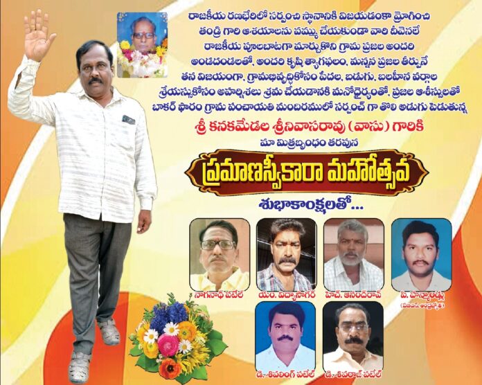 గ్రామ ప్రజల సహాయ సహకారాలతో గ్రామ సర్పంచ్ గా నన్ను అత్యధిక మెజార్టీతో ఎన్నుకున్న ప్రజలందరికీ హృదయపూర్వక వందనములు. మీరు ఇచ్చిన అవకాశాన్ని వమ్ము చేయకుండా గ్రామ అభివృద్ధి కి నేను నాతో పాటు మీరు ఎన్నుకున్న వార్డ్ సభ్యులం అందరం, ఉప సర్పంచ్ సమిష్టిగా కృషి చేస్తామని ప్రమాణస్వీకారం చేయనున్నాం. మా విజయం మీ అందరి విజయంగా నేను భావిస్తున్నాను. ఈ కార్యక్రమానికి గ్రామస్తులు అందరూ ఉదయం 9 గంటలకు గ్రామ పంచాయతీ కార్యాలయం వద్దకు తప్పకుండా రాగలరు.