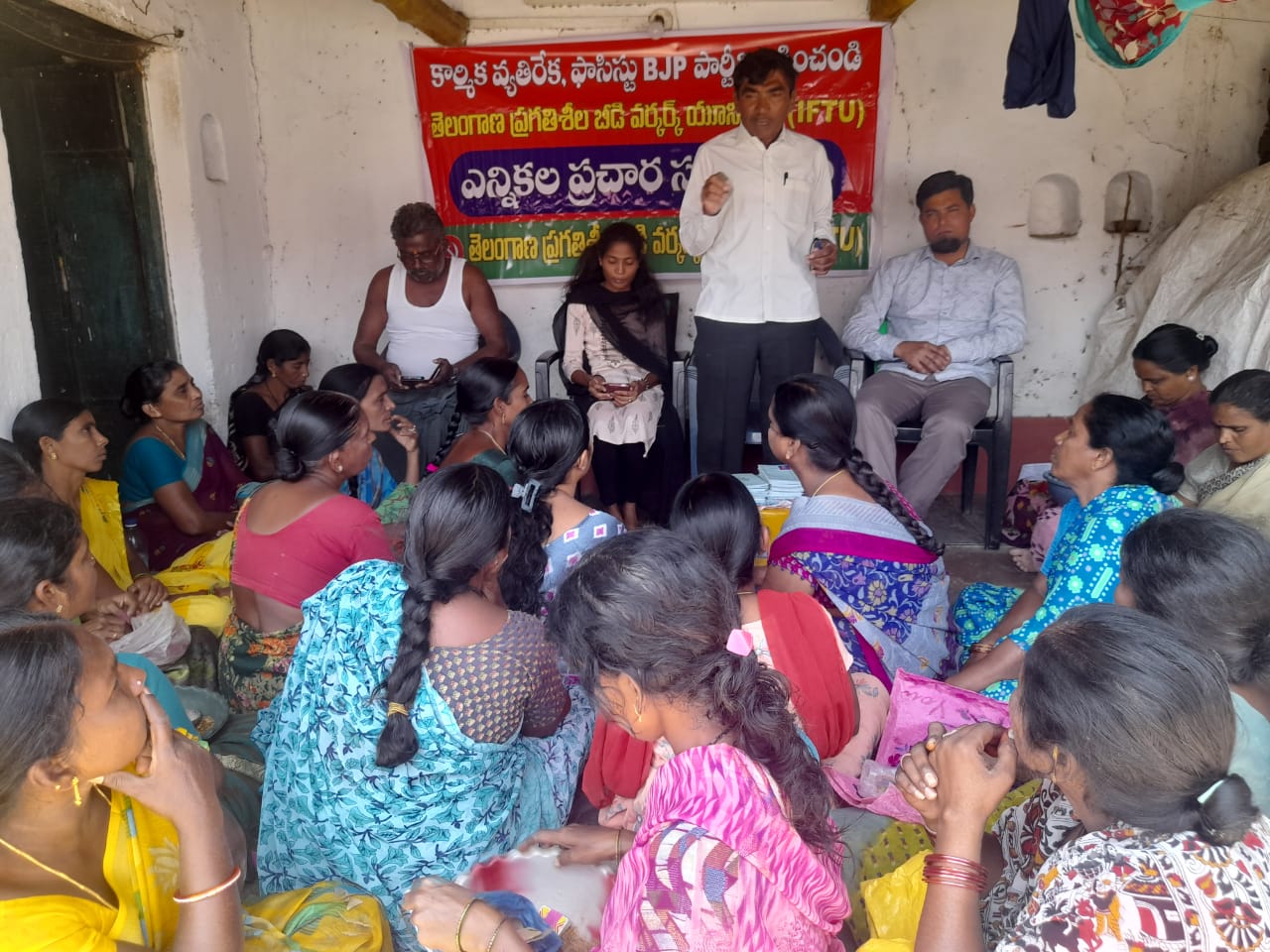 నిజామాబాద్ జిల్లా ఎడపల్లి మండలం జానకంపేట గ్రామంలో ఎన్నికల ప్రచారంలో భాగంగా బీడీ కార్మికులతో ఏర్పాటు చేసిన సమావేశంలో తెలంగాణ ప్రగతిశీల బీడీ వర్కర్స్ యూనియన్ (ఐ ఎఫ్ టి యూ) జిల్లా ఉపాధ్యక్షులు బి. మల్లేష్ మాట్లాడుతూ దేశంలో గత పది సంవత్సరాలుగా కార్మిక వ్యతిరేక విధానాలను అనుసరిస్తూ, దేశ, విదేశీ బడా పెట్టుబడి దారులకు అనుకూలంగా పరిపాలన కొనసాగిస్తూ, దేశంలో ప్రజల మధ్య ఐక్యతను దెబ్బతీస్తూ ఫాసిస్టు విధానాలను అమలు చేస్తున్న బీజేపీ పార్టీని ఓడించాలని కార్మికులకు బి. మల్లేష్ కార్మికులకు పిలుపు నిచ్చారు. బీడీ పరిశ్రమపై అత్యధికంగా జీఎస్టీని వేసి లాభాలను పొందుతూ మరోవైపు పరిశ్రమని నిర్వీర్యపరిచి,అందులో పని చేసే బీడీ కార్మికులను 26 దినాలు పని లేకుండా చేసి, రోడ్డుపాలు చేస్తుందని, కార్మికులు కష్టపడి పీఎఫ్ ను జమ చేసుకుంటే, అట్టి పీఎఫ్ డబ్బులు నుండి 20% షేర్ మార్కెట్లో పెడుతుందని, మరోవైపు వారి సంక్షేమం కోసం గతంలో అమలు చేసిన పథకాలను రద్దు చేసిందని, అట్లాగే వారు రాజీనామాలు చేసిన తర్వాత ఇచ్చేటటువంటి పెన్షన్ను పెంచాలని పది సంవత్సరాలుగా పోరాడుతున్న కనీసం ఏమాత్రం పెంచలేదని అందుకే బీడీ కార్మికులు బీ జే పీ పార్టీకి ఓటు వేయోద్దన్ని బీడీ కార్మికులకు బి.మల్లేష్ వివరించారు.