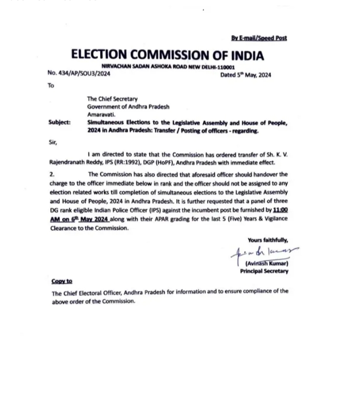 ఊహించిందే జరిగింది. ఆలస్యమైనప్పటికీ ఏపీ డీజీపీ రాజేంద్రనాధ్రెడ్డిపై ఎన్నికల సంఘం ఎట్టకేలకూ వేటు వేసింది. ఎన్నికల విధుల నుంచి తప్పిస్తూ ఉత్తర్వులు జారీ చేసిన వైనం అధికార వైసీపీకి షాక్ నిచ్చింది. డీజీపీ రాజేంద్రనాథ్ రెడ్డిపై బదిలీ వేటు పడింది. ఎన్నికల వేళ విధులు సవ్యంగా నిర్వర్తించడం లేదంటూ ఆయన ఈసీ బదిలీ వేటు వేసింది.విధుల నుంచి తక్షణమే రిలీవ్ అవ్వాలని ఆదేశించింది. ఎన్నికలు పూర్తయ్యే వరకు ఎలాంటి ఎన్నికల విధులు ఆయనకు అప్పగించొద్దని ఈసీ స్పష్టం చేసింది. వెంటనే ఆయన కిందిస్థాయి అధికారికి బాధ్యతలు అప్పగించి రిలీవ్ కావాలని ఆదేశించింది. ఈ మేరకు కేంద్ర ఎన్నికల సంఘం ఉత్తర్వులు జారీ చేసింది. సోమవారం ఉదయం 11 గంటల లోపు కొత్త డీజీపీని నియమించాలంటూ రాష్ట్ర ప్రభుత్వాన్ని ఆదేశించింది. ఇందుకోసం ముగ్గురు డీజీపి ర్యాంకు పేర్లను పంపించాలని ప్రభుత్వానికి సూచించింది.