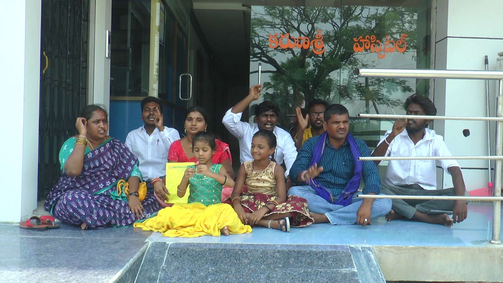 తన మద్దతు దారులతో ఆస్పత్రి ప్రధాన ద్వారం ముందు కూర్చుని నిరసన ..ఆస్పత్రి డాక్టర్ పై యాజమాన్యం పై చర్యలు తీసుకుని