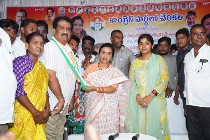 మంగళవారం మండలంలోని వెలికట్ట శివారు శ్రీనివాస ఫంక్షన్ హాల్ లో పాలకుర్తి ఎమ్మెల్యే యశస్విని ఝాన్సి రెడ్డి, కాంగ్రెస్ పార్టీ పాలకుర్తి నియోజకవర్గ ఇన్చార్జి ఝాన్సీ రాజేందర్ రెడ్డిల సమక్షంలో మడిపల్లి, కంటయపాలెం, మాటేడు, తొర్రూరుకు చెందిన సుమారు 2000 మంది కార్యకర్తలతో కలిసి కాంగ్రెస్ తీర్థం పుచ్చుకున్నారు, ఎమ్మెల్యే యశస్విని రెడ్డి , నియోజకవర్గ ఇంచార్జ్ ఝాన్సీ రాజేందర్ రెడ్డి, కాంగ్రెస్ పార్టీ కండువా కప్పి పార్టీలోకి ఆహ్వానించారు.