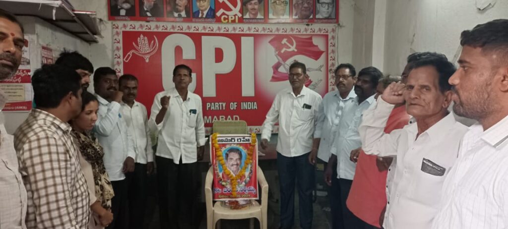 సిపిఐ జిల్లా కార్యాలయంలో కామ్రేడ్ బందెల నరసయ్య కొత్తగూడెం జిల్లా సిపిఐ కార్యవర్గ సభ్యులు, తెలంగాణ దళిత హక్కుల పోరాట సమితి రాష్ట్ర అధ్యక్షులు అకాల మరణం చెందినారు ఆయన చిత్రపటానికి పూలమాలవేసి నివాళులు అర్పించడం జరిగింది.