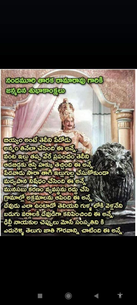 నటుడిగా ఉన్నప్పుడే వరద బాధితుల కోసం జోలె పట్టుకుని ఊరూరా తిరిగిన అన్నగారు. అధికారంలోకి వచ్చాక తెలుగు వాడి శ్రేయస్సే ధ్యేయంగా పాలన సాగించారు. అడ్మినిస్ట్రేషన్లో అంతర్లీనంగా అన్నగారు పాటించే సూత్రం ప్రజోపయోగం ఒక్కటే. ఎంత ప్రజారంజకంగా పాలించారో… అదే స్థాయిలో రాజకీయాలూ నడిపారు. తెలుగోడి సత్తాను దేశమంతా తెలిసేలా చేశారు. రాజకీయంగా తనపై జరిగిన కుట్రలను ప్రజా బలంతోనే తిప్పికొట్టారు.