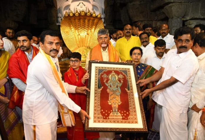 ఏపీ ముఖ్యమంత్రి చంద్రబాబు కుటుంబ సమేతంగా తిరుమల శ్రీవారిని దర్శించుకున్నారు. అంతకుముందు ఆయనకు తిరుమల తిరుపతి దేవస్థానం జేఈవో గౌతమి, ఆలయ అధికారులు ఘన స్వాగతం పలికి దర్శన ఏర్పాట్లు చేశారు. దర్శనానంతరం వేదపండితులు వారిని ఆశీర్వదించి తీర్థప్రసాదాలు, స్వామివారి చిత్రపటం అందజేశారు.