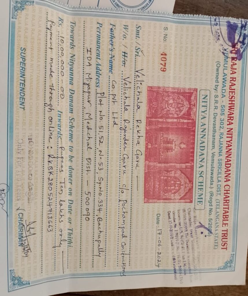 వేములవాడ ఆలయ అభివృద్ధికి కరీంనగర్ కాంగ్రెస్ పార్టీ పార్లమెంట్ ఇంచార్జ్ వెలి చాలా రాజేంద్ర రావు తన ఉదారతను చాటుకున్నారు.