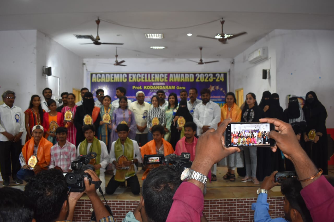 ఇంటర్ లో అధిక మార్కులు సాధించి ప్రతిభ కనబరచిన విద్యార్థులకు సన్మానం తత్కారాలు అందజేస్తామన్నారు. అకాడమీ ఎక్స్లెన్స్ అవార్డు కార్యక్రమానికి ముఖ్య అతిథిగా తెలంగాణ జన సమితి అధ్యక్షులు ప్రొఫెసర్ కోదండరాం హాజరై మాట్లాడుతు జిల్లా వ్యాప్తంగా కళాశాల్లలో టాపర్లు నిలిచిన విద్యార్థులకు 4 సంవత్సరాలు గా టివియువి విద్యార్థి సంఘం ఆధ్వర్యంలో నిర్వహిస్తున్నారు. ఇంటర్ ఫలితాల్లో మంచి మార్కులు సాధించిన విద్యార్థులకు శుభాకాంక్షలు తెలిపారు. జిల్లా నుంచి రాష్ట్రంలో నెం-1 ర్యాంకు సాధించిన అంకిత విద్యార్థిని అభినందించారు. జీవితంలో చదువును మధ్యలో ఆగిపోద్దు. ప్రయాణంలో ఇంటర్ విద్య మొదటి అడుగు. ప్రతి సంవత్సరం ఉన్నత చదువుల్లో ఇలాంటి అవార్డులను తీసుకోవాలని అన్నారు. నిరుద్యోగ సమస్యలు కోసం విద్యార్థులు ఉద్యమాలు చెయ్యాలి తప్ప ఉద్యమంలో ప్రాణాలు కోల్పోయే విధంగా ఉద్యమాలు చేయవద్దని , నిరుద్యోగ సమస్యలు కోసం ఆమరణ నిరాహారదీక్ష చెస్తున్న మోతిలాల్ దీక్ష విరమణ చేయ్యాలని కోరారు. సమస్యల పరిష్కారానికి ప్రభుత్వం దృష్టికి తీసుకు వెళ్తామని చెప్పారు.