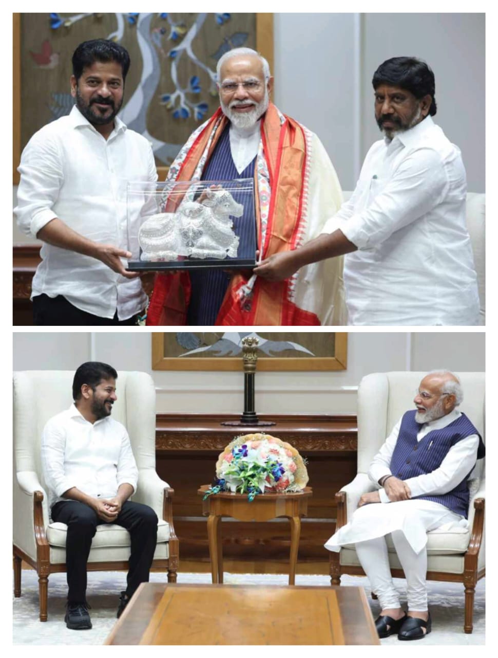 రాష్ట్రానికి సంబంధించిన పలు అంశాలపై చర్చించేందుకు సీఎం రేవంత్ రెడ్డి గురువారం ఢిల్లీలో ప్రధాని నరేంద్ర మోదీని కలిశారు.తెలంగాణ ముఖ్యమంత్రి గురువారం ఇక్కడ ప్రధాని నరేంద్ర మోడీని కలుసుకుని రాష్ట్రానికి సంబంధించిన పలు అంశాలపై చర్చించినట్లు అధికార వర్గాలు తెలిపాయి. సమావేశంలో ఉప ముఖ్యమంత్రి భట్టి విక్రమార్క మల్లు రెడ్డి వెంట ఉన్నారు.గత నెలలో మూడోసారి ప్రధానిగా ప్రమాణ స్వీకారం చేసిన తర్వాత మోదీ, రెడ్డిల మధ్య జరిగిన తొలి సమావేశం ఇదే . దక్షిణాది రాష్ట్రంలోని పెండింగ్లో ఉన్న కీలక ప్రాజెక్టులపై తెలంగాణ ముఖ్యమంత్రి మోదీతో చర్చించినట్లు ఆ వర్గాలు తెలిపాయి .ముందు రోజు, రెడ్డి కేంద్ర హోం మంత్రి అమిత్ షాతో సమావేశమయ్యారు మరియు ఇద్దరు నేతలు తెలంగాణకు సంబంధించిన విషయాలపై చర్చించారు. చర్చల వివరాలను అధికారికంగా వెల్లడించనప్పటికీ, రాష్ట్రానికి సంబంధించిన అభివృద్ధి ప్రాజెక్టులు, కేంద్ర సాయం తదితర అంశాలు ఎజెండాలో ఉన్నట్లు తెలిసింది.గత ఏడాది దక్షిణాది రాష్ట్రంలో జరిగిన అసెంబ్లీ ఎన్నికల్లో కాంగ్రెస్ విజయం సాధించడంతో రెడ్డి తెలంగాణ ముఖ్యమంత్రిగా బాధ్యతలు చేపట్టారు .