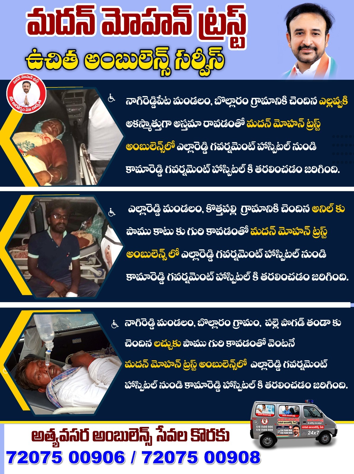 నాగిరెడ్డి మండలం, బొల్లారం గ్రామం, పల్లె పొగడ్ తండా కు చెందిన లచ్చు కు పాము గురి కావడంతో వెంటనే మదన్ మోహన్ ట్రస్ట్ అంబులెన్స్ లో ఎల్లారెడ్డి గవర్నమెంట్ హాస్పిటల్ నుండి కామారెడ్డి హాస్పిటల్ కి తరలించడం జరిగింది. ఎల్లారెడ్డి మండలం, కొత్తపల్లి గ్రామానికి చెందిన అనిల్ కు పాము కాటు కు గురి కావడంతో మదన్ మోహన్ ట్రస్ట్అంబులెన్స్ లో ఎల్లారెడ్డి గవర్నమెంట్ హాస్పిటల్ నుండి కామారెడ్డి గవర్నమెంట్ హాస్పిటల్ కి తరలించడం జరిగింది. నాగిరెడ్డిపేట మండలం, బొల్లారం గ్రామానికి చెందిన ఎల్లవ్వ కి అకస్మాత్తుగా అస్తమా రావడంతో మదన్ మోహన్ ట్రస్ట్ అంబులెన్స్ లో ఎల్లారెడ్డి గవర్నమెంట్ హాస్పిటల్ నుండి కామారెడ్డి గవర్నమెంట్ హాస్పిటల్ కి తరలించడం జరిగింది.